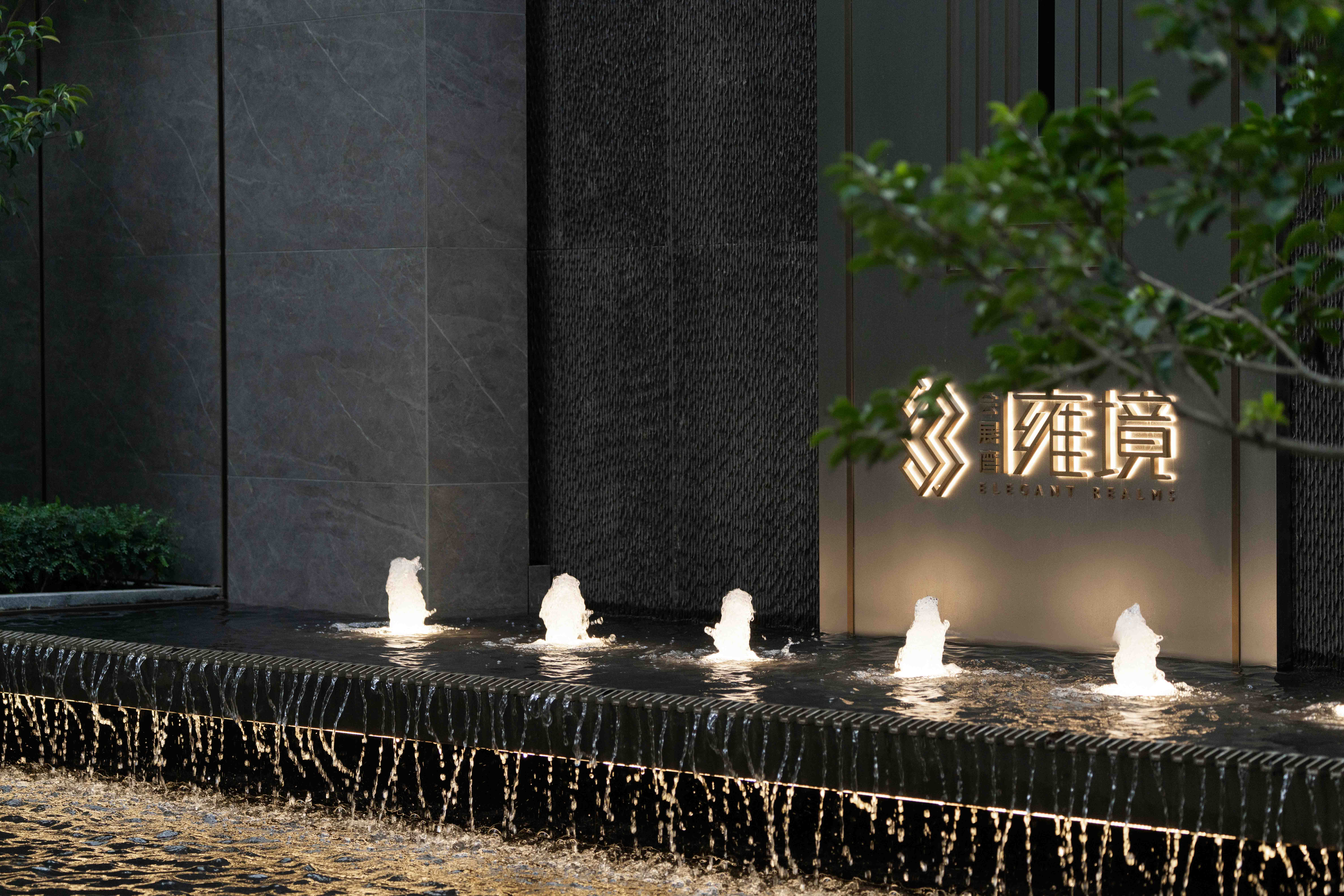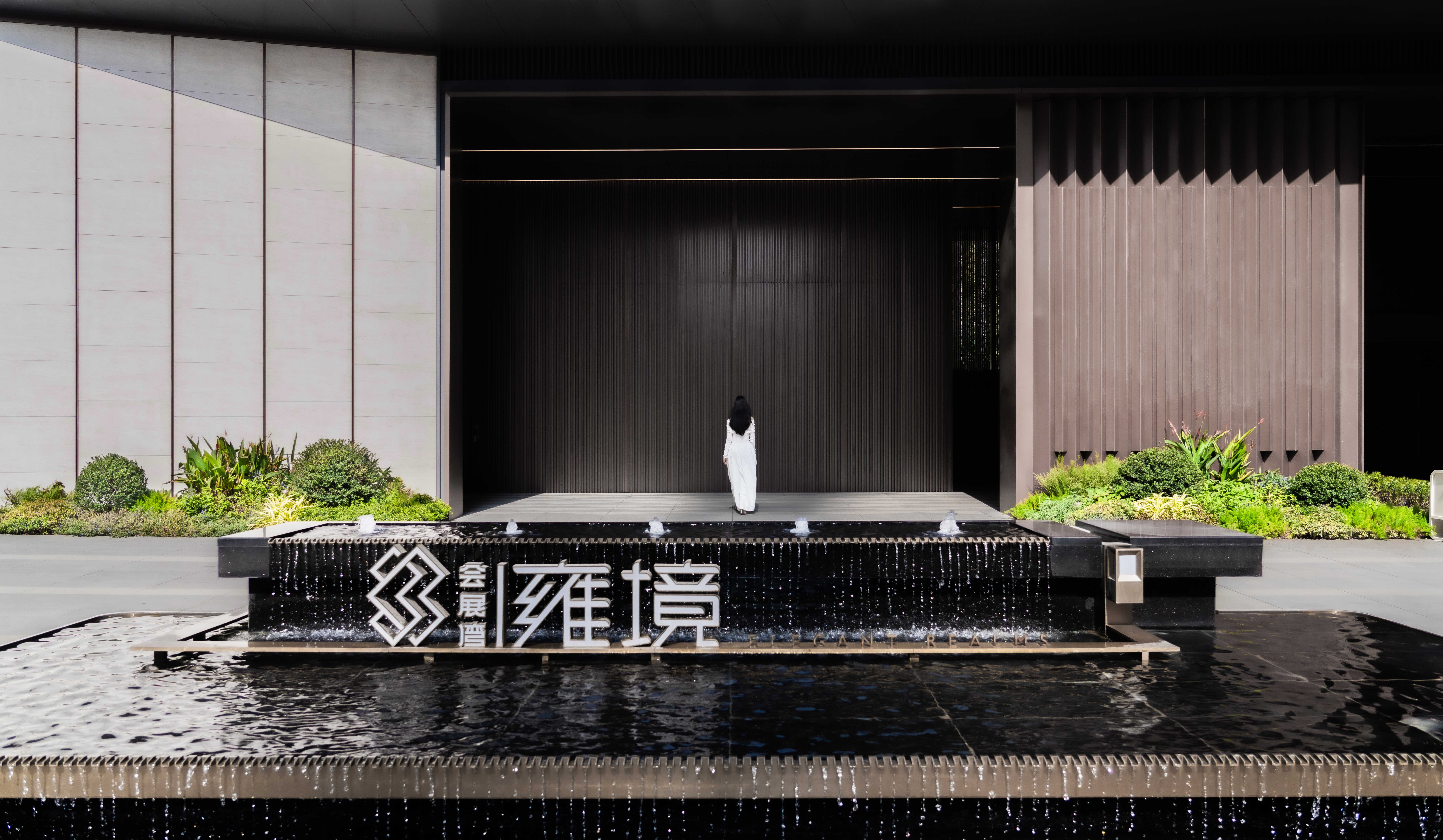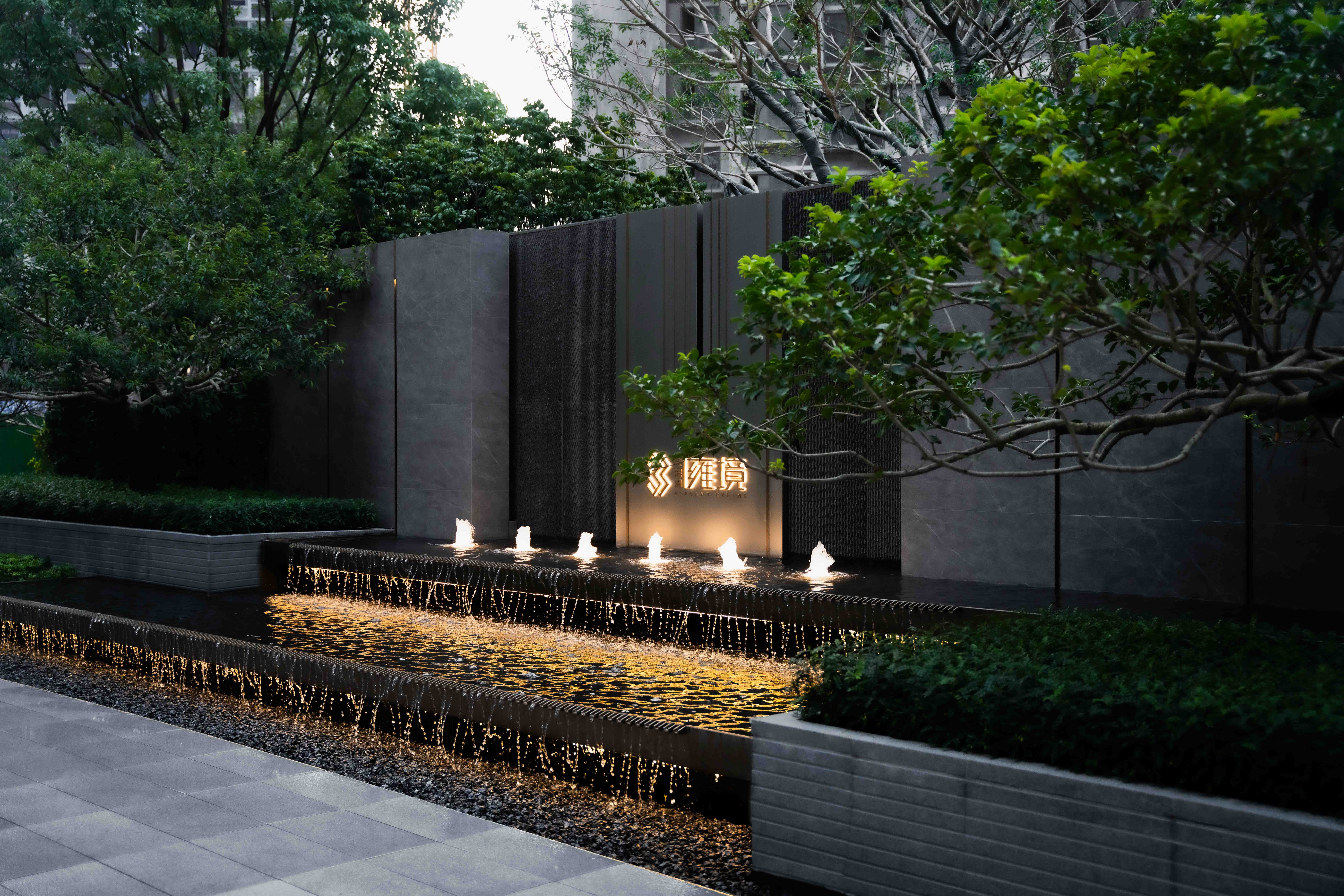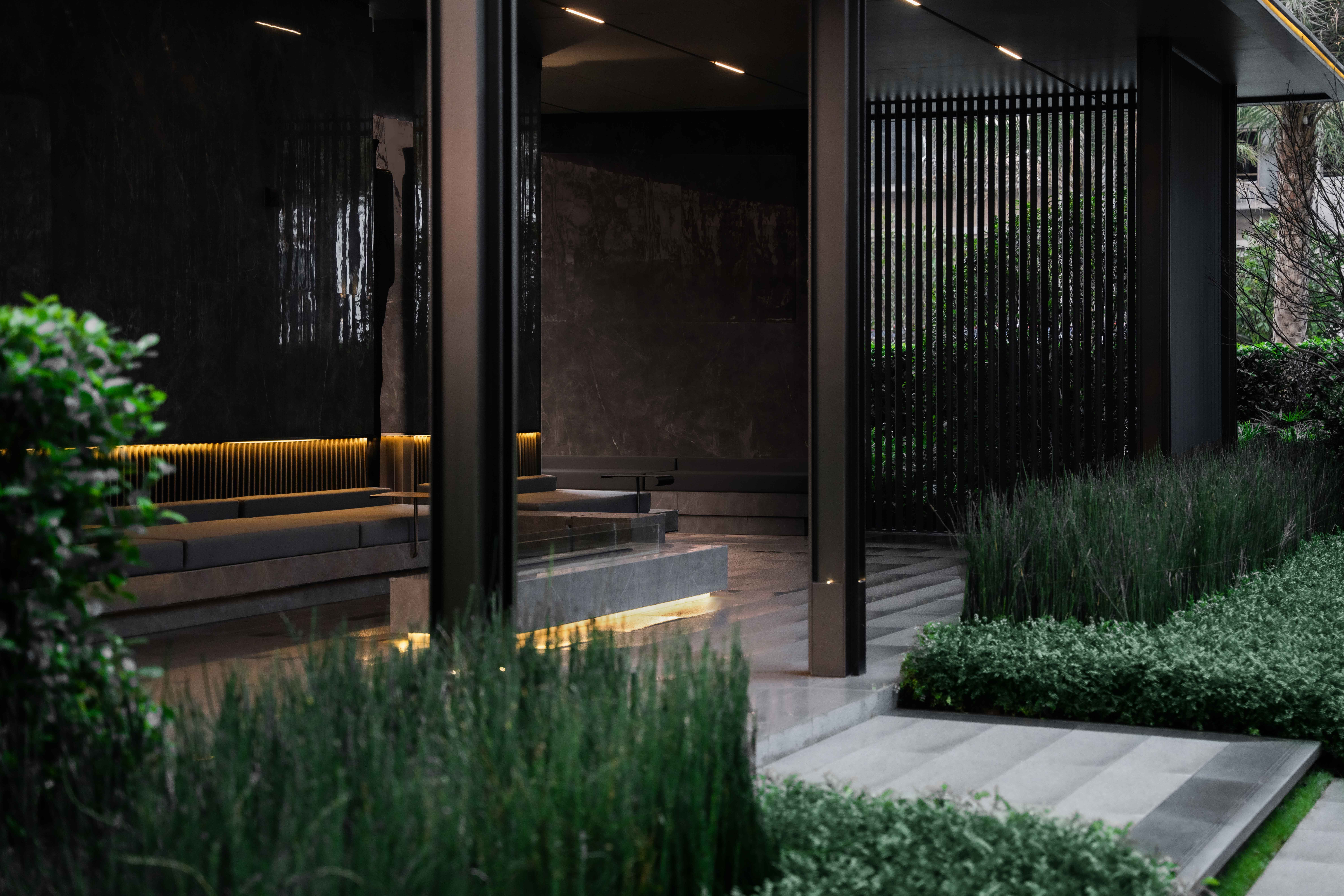 步道尽头,黑色的水幕墙无声地流趟着水的姿态,一棵造型优美的铁冬青摇曳生姿,极尽格调与意趣。精致的景墙与细腻的叠水结合形成视觉焦点,引导业主从视觉空间到心理感受上,从外部环境的繁华热闹“转场”为内部空间的品质宁静,营造秩序奢华的归家体验。
