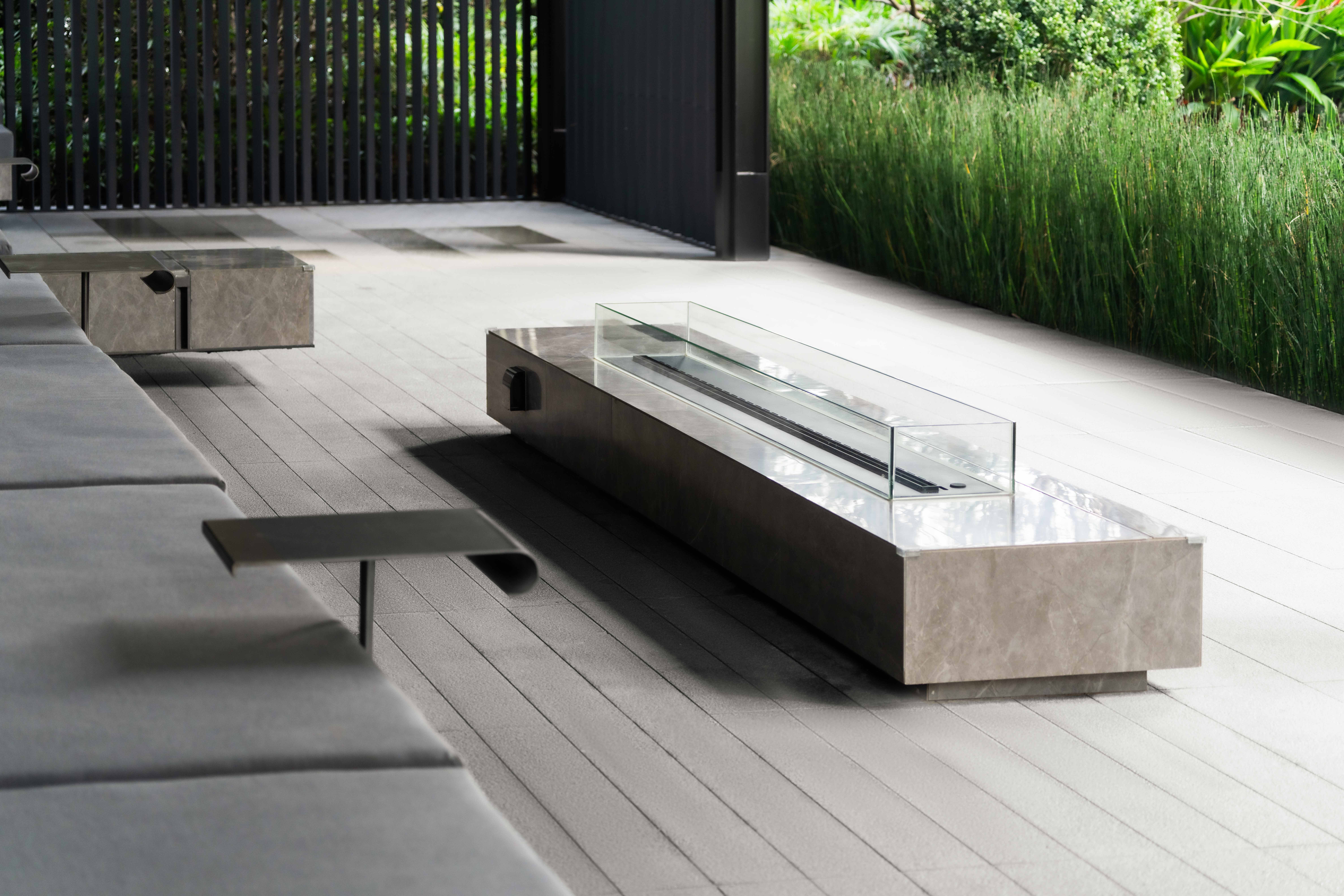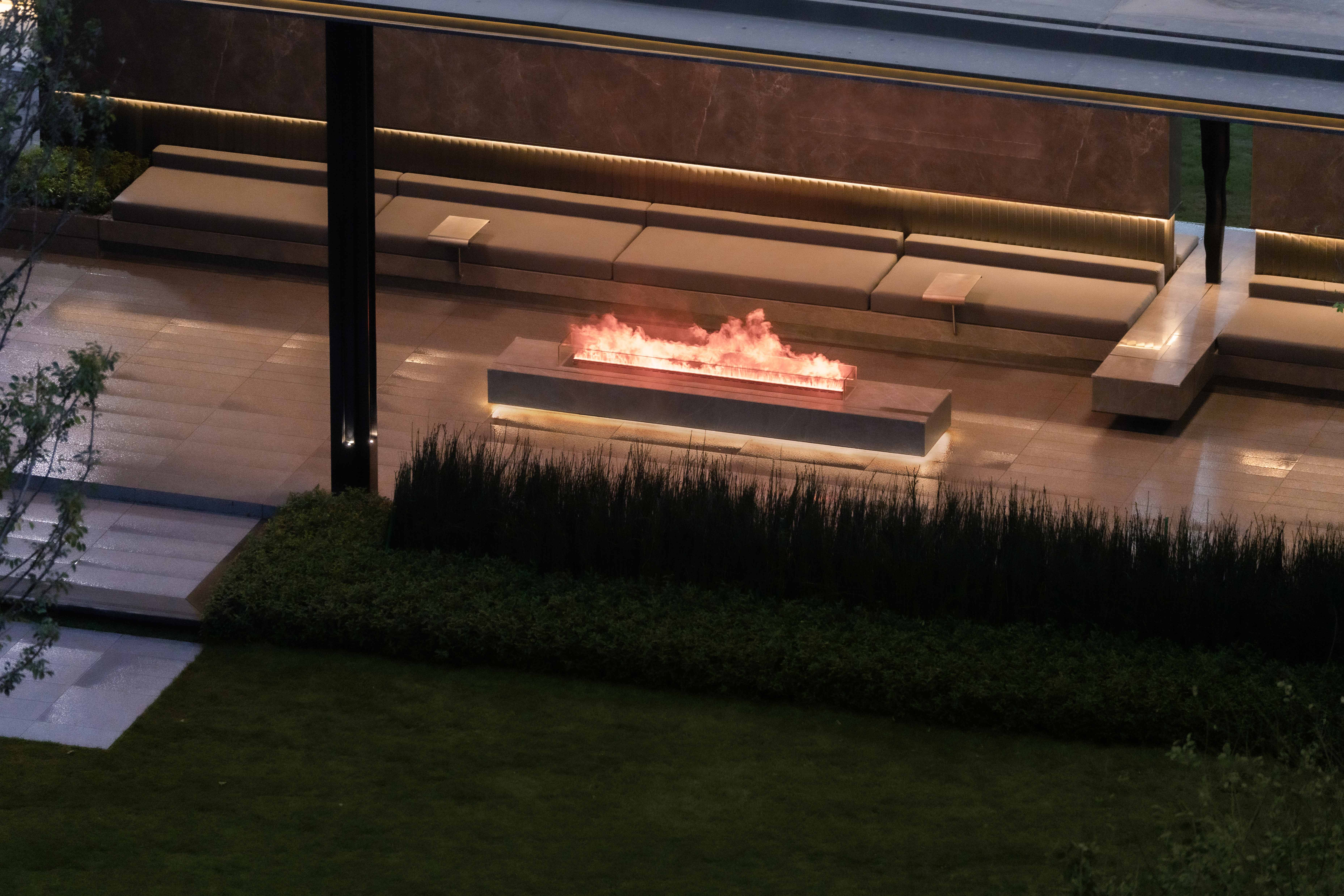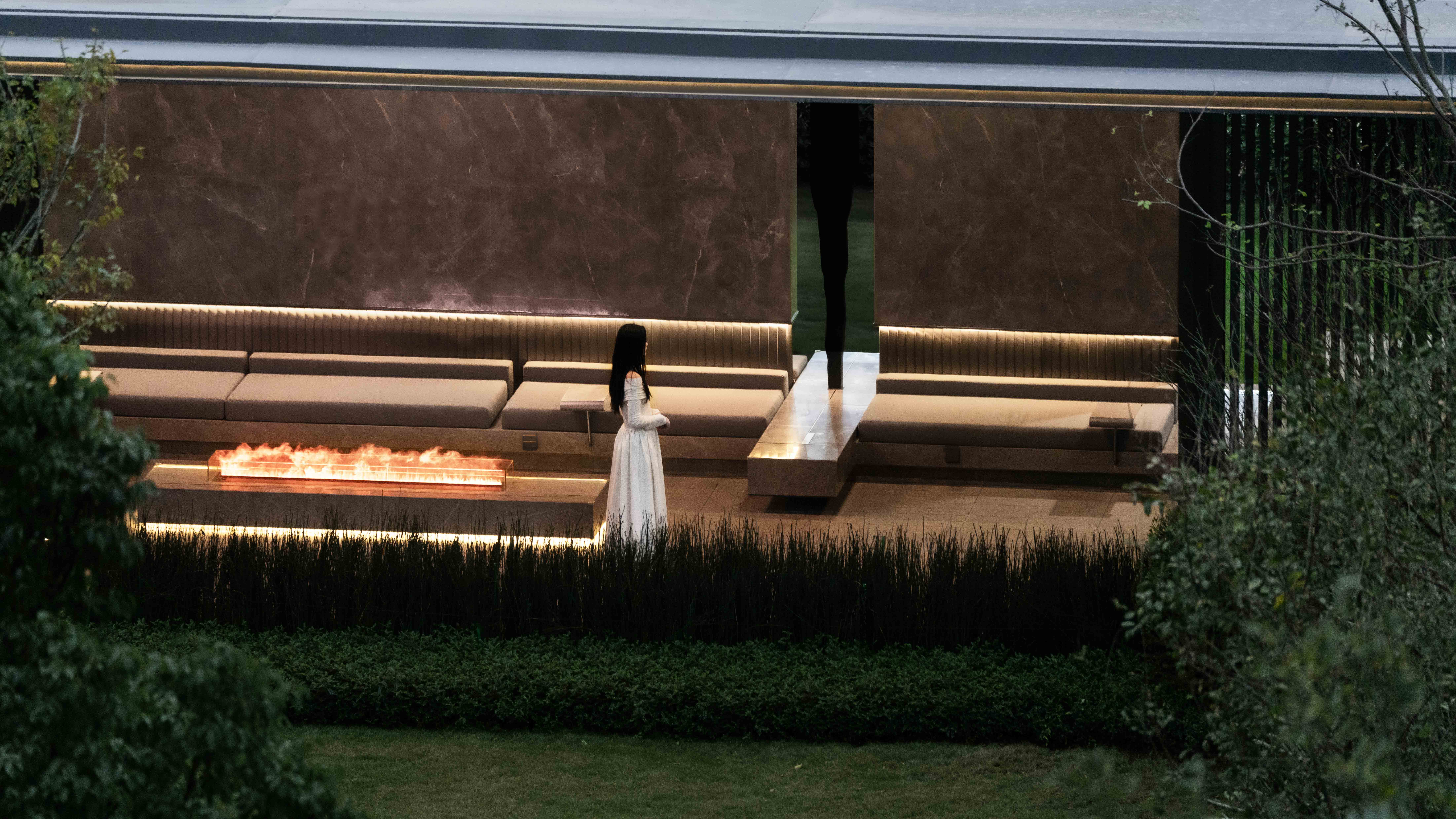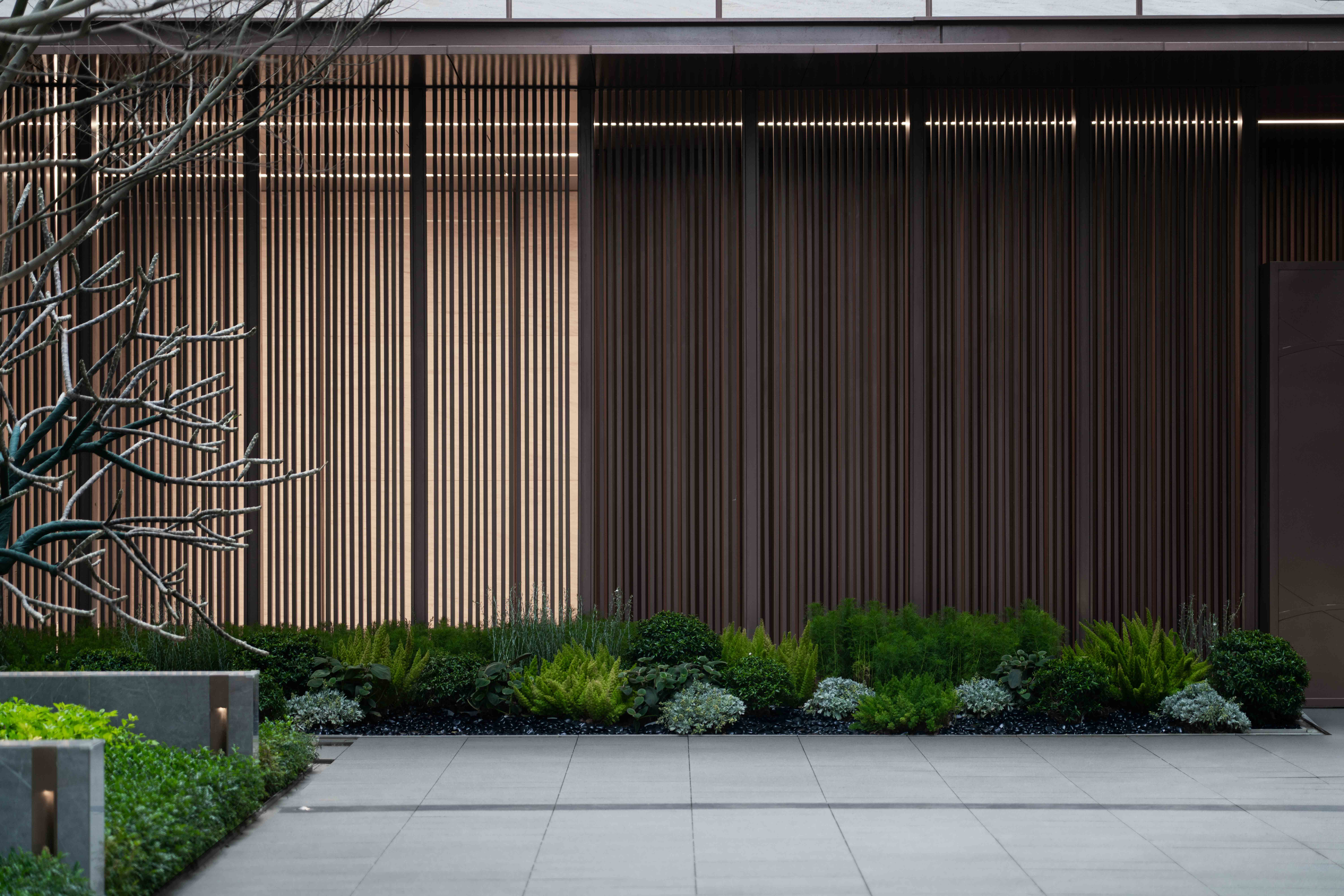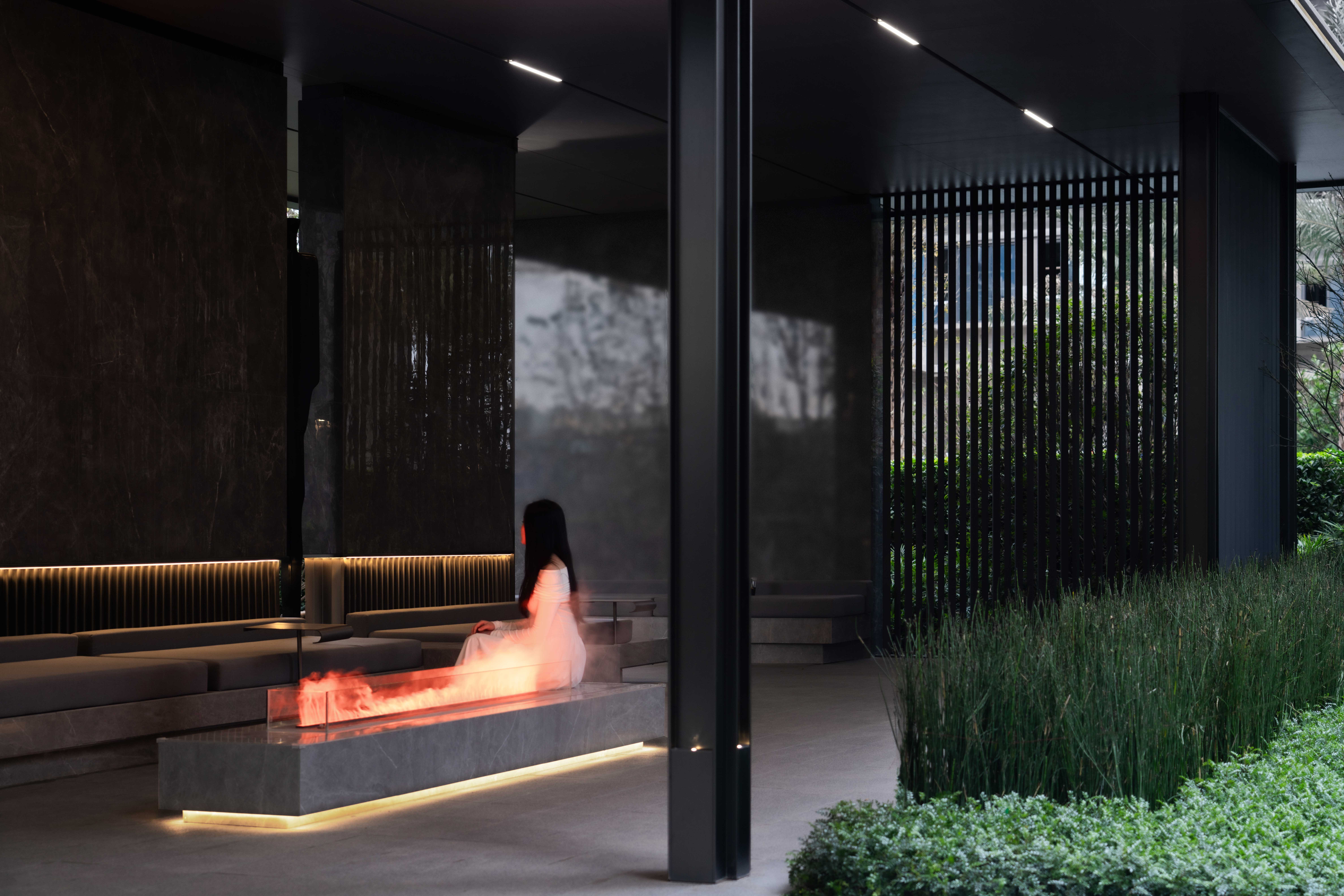步道尽头,黑色的水幕墙无声地流趟着水的姿态,一棵造型优美的铁冬青摇曳生姿,极尽格调与意趣。精致的景墙与细腻的叠水结合形成视觉焦点,引导业主从视觉空间到心理感受上,从外部环境的繁华热闹“转场”为内部空间的品质宁静,营造秩序奢华的归家体验。