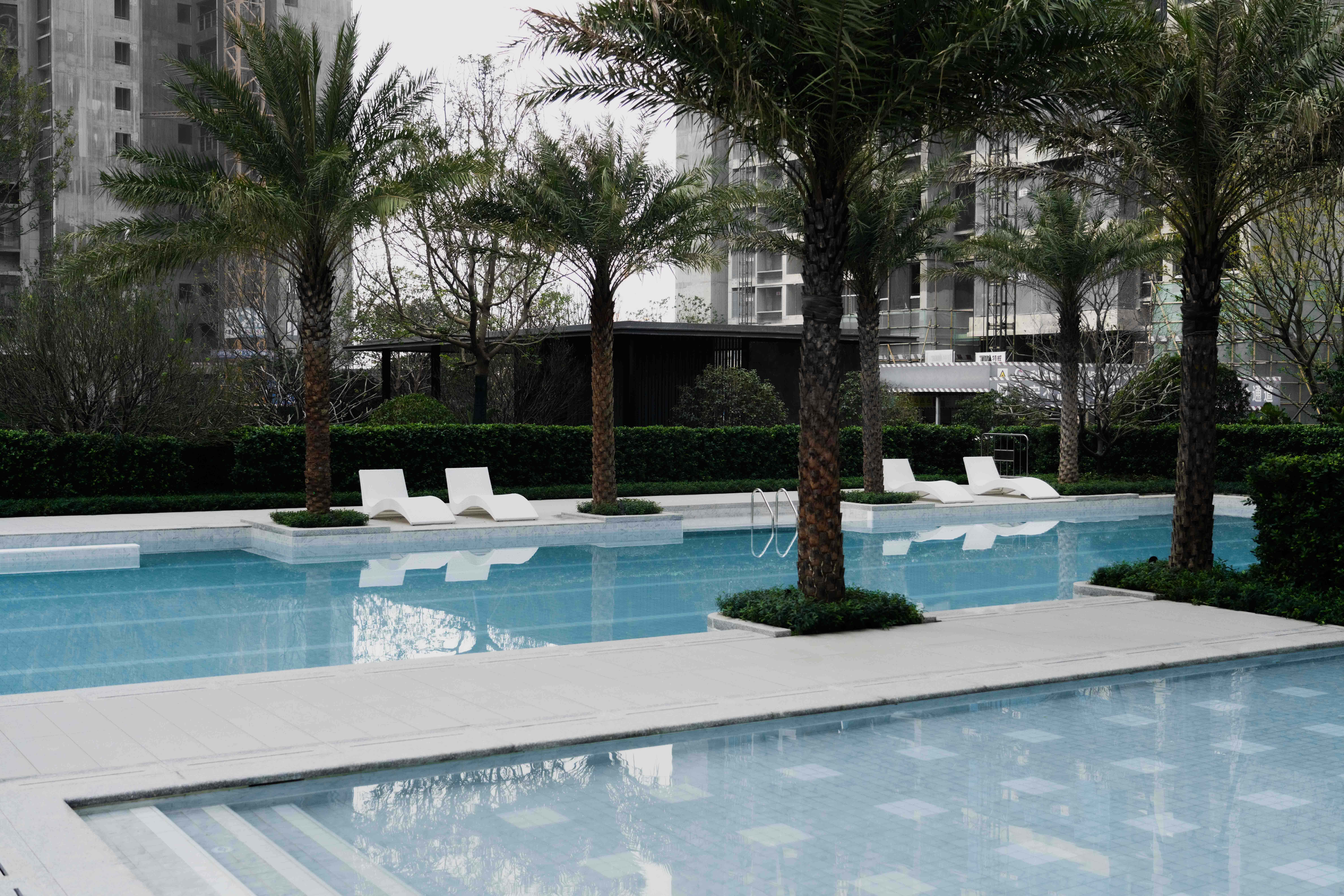 泳池选用仿大理石纹理的马赛克呈现Tiffany蓝的泳池效果,体现浓浓度假风情。